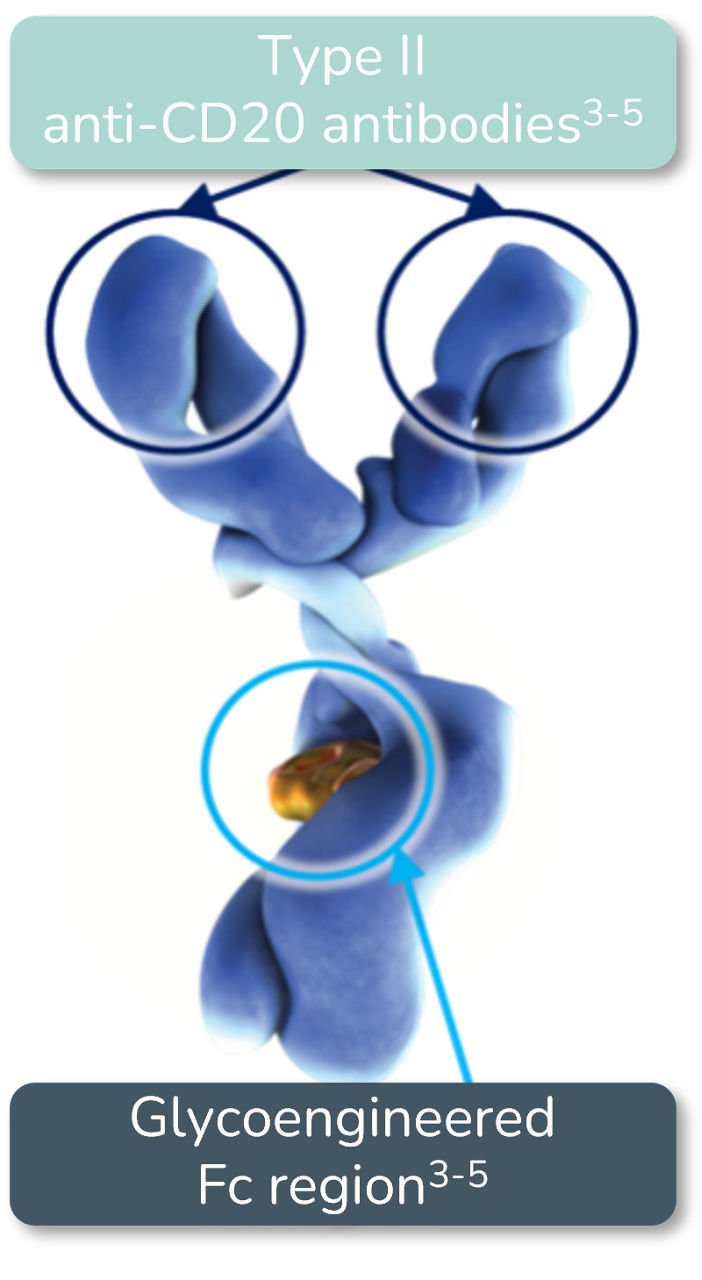 •Typ II-bindningskonformationen: Ökar direkt celldöd, med minskad internalisering och mindre beroende av komplementberoende cytotoxicitet3-5