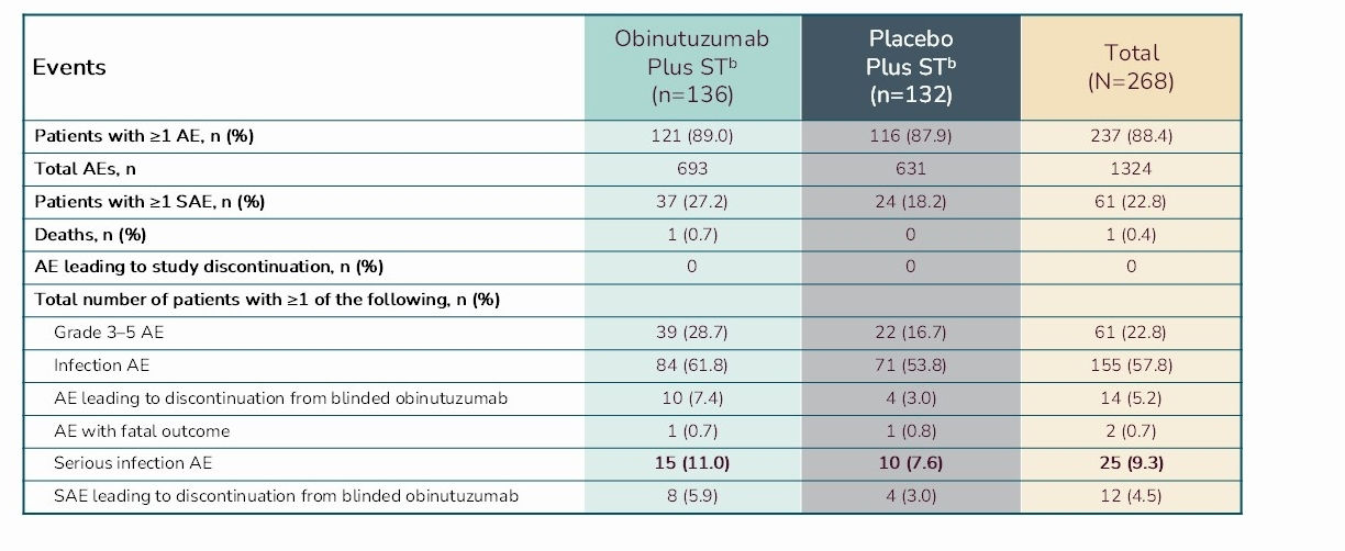 aThe safety population included all the patients who received any infusion of obinutuzumab or placebo in a blinded manner; the patients were grouped according to the infusion that was administered, regardless of the randomly assigned study group;